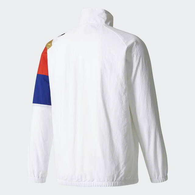 左肩から前身頃斜めに大きく入るadidasロゴと金赤青の配色がシャープなデザイン。